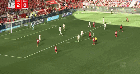 第45+1分鐘,布恩迪亞兜射破門,勒沃庫森2-0