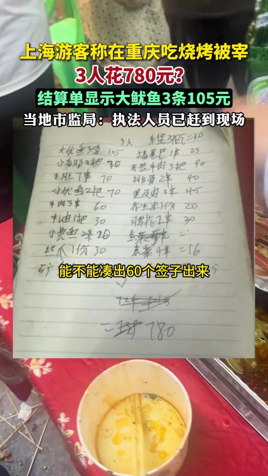 為您提供精彩短視頻《上海游客稱在重慶吃燒烤被宰,3人花780元?》如果您對(duì)該比賽精彩視頻回放感興趣,可以收藏并關(guān)注我們。